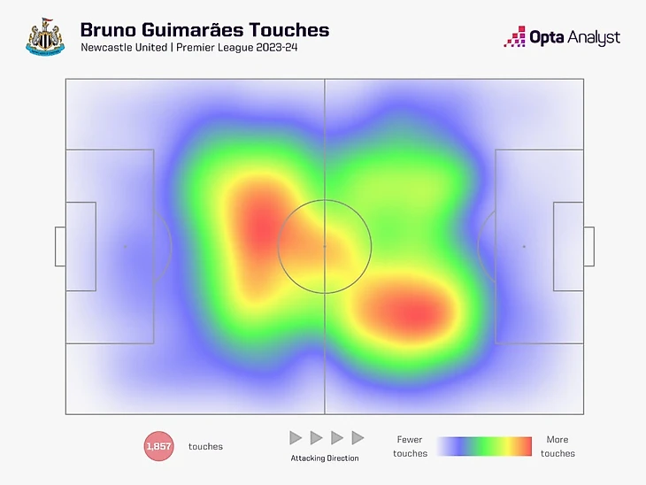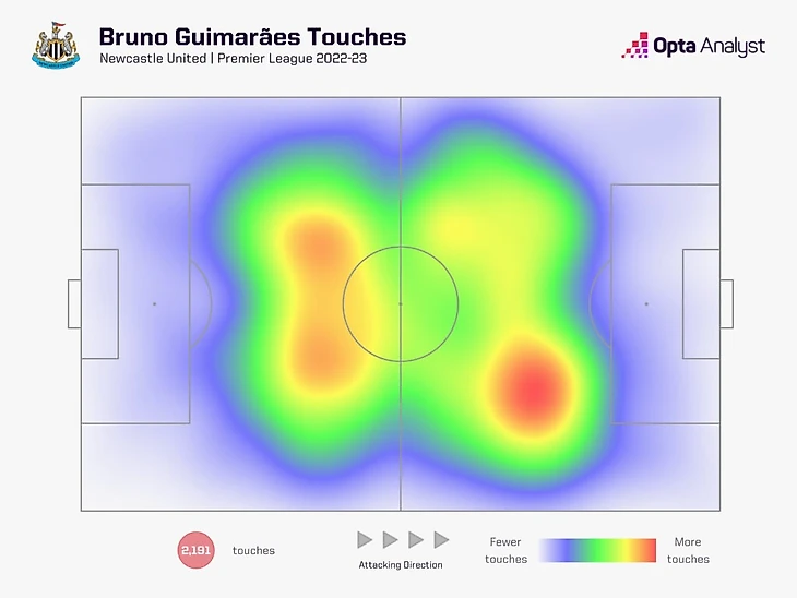 Как вы можете видеть из его тепловых карт ниже, в этом сезоне Гимараэс стал более универсальным, его объем и фронт работы расширился, он не только чаще играл в более глубоких зонах «Ньюкасла» по сравнению с прошлым сезоном, при этом он и стал более активным впереди.