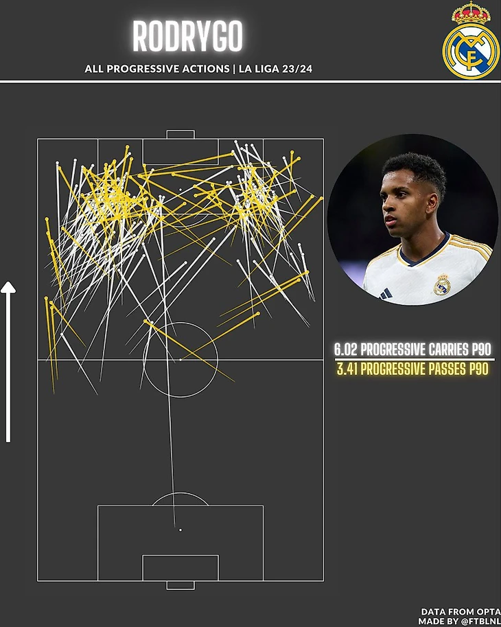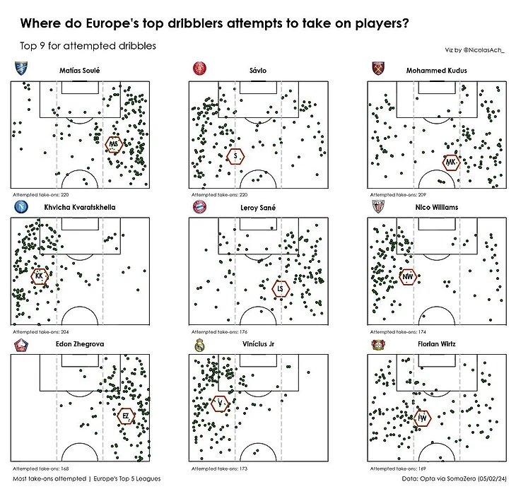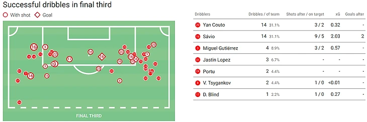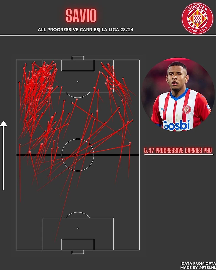 «Мы давно следили за Савио. Признаюсь, с тех пор, как в «Реале» появился Винисиус, я больше не видел игрока, который с легкостью может эффективно обыгрывать соперников один в один», – прокомментировал Мичел игру Савио. И этот сезон лишь подтвердил это-на счету Савиньо 104 удачные обводки, из игроков топ-5 лиг только Кудус финтил чаще.