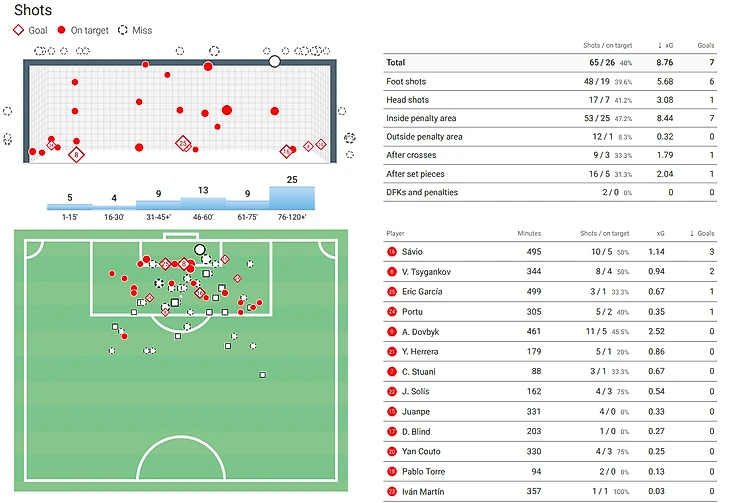 На все это ушел 161 удар, из них 77 в створ (48%). Конверсия ударов в голы 16%. Для сравнения у Габриэла Жезуса в прошедшем сезоне этот показатель составил 7,7%. Одному 17 лет, другой у Гвардиолы переиграл.
