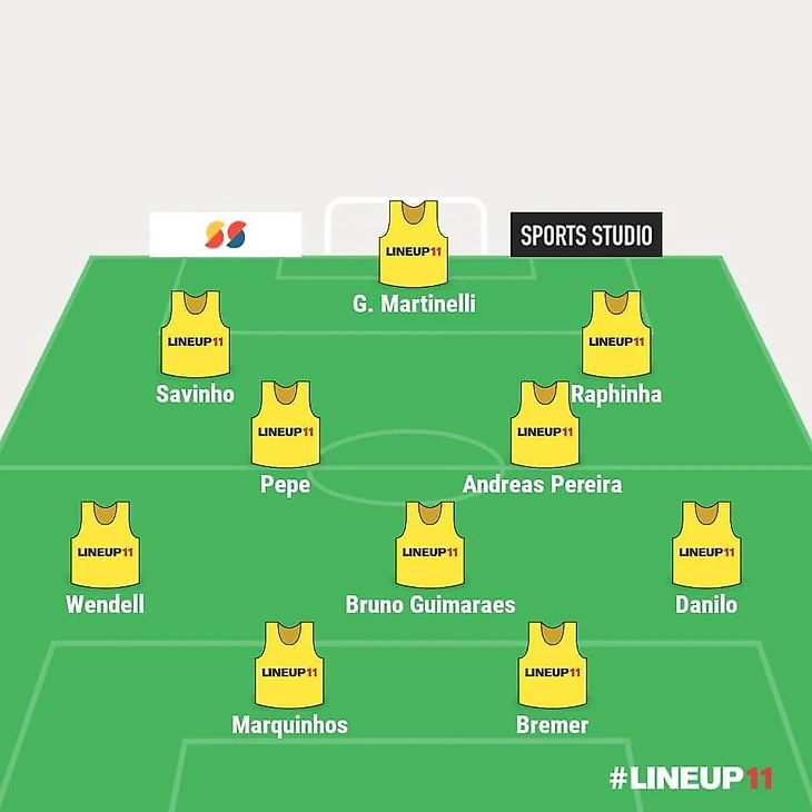 4. Данило, Маркиньос, Бремер и Венделл; Бруно Гимараэс, Пепе и Андреас Перейра; Савиньо, Рафинья и Габриэл Мартинелли.
