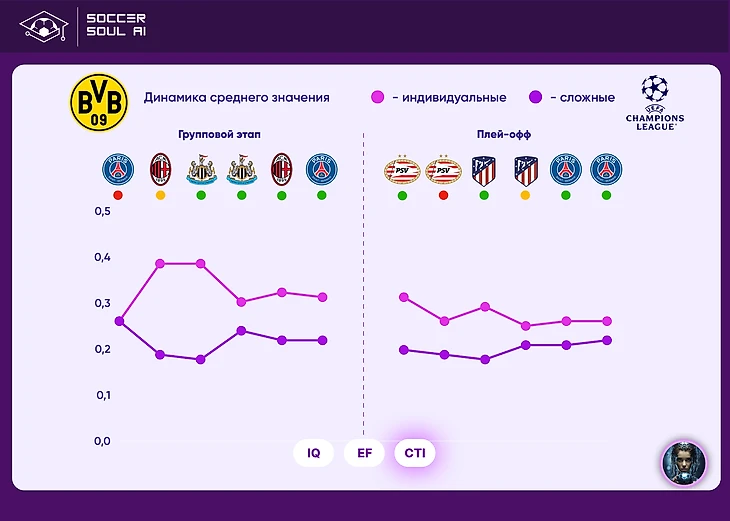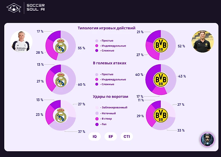 У Боруссии такой вариант один – показать IQ выше 17,7 при эффективности продвижения не ниже 24%. Реал такое позволял и Лейпцигу, и Сити, и Баварии, но тем не менее не проиграл. А вот сама Боруссия оба поражения потерпела именно при раскладе с одновременно худшими показателями IQ и EF. Так, что вероятности подтверждают статус фаворита.