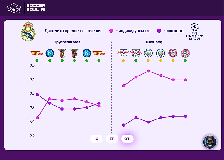 Так вот, Реал показал интересную тенденцию к перестроению игры. Если на групповом этапе, где Мадрид всех крушил, средняя доля сложных элементов составляла 22%, то в плей-офф она составила лишь 13%, в отдельных матчах опускаясь до 7%-9%. Одновременно противоположная история происходит с долей индивидуальных элементов: 20% - групповой этап, 38(!)% - плей-офф.