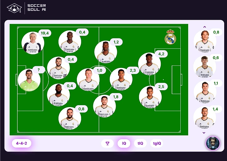 Реалу для победы необходимы 20,3 IQ. Даже с потенциально самыми перспективными заменами предлагаемый состав набирает только 95%. Есть конечно загадочный (с точки зрения отсутствия статистики текущего ЛЧ-сезона) Куртуа, но компенсирует ли он недобор в 0,9 IQ? В любом случае, 95% - не критично, учитывая, что в запасе у Мадрида есть еще один возможный расклад с одновременным доминированием по IQ и эффективности, который совсем не выглядит сказочным.