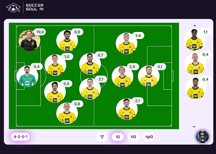 Например, Родриго в среднем за 90 минут игры приносит Реалу 3,4 IQ. Хоселу способен набрать 1,4 IQ за 25 минут игры. Соответственно, рокировка этих футболистов в районе 65 минуты потенциально может добавить клубу + 0,4 балла. Столь перспективных замен у Реала, благодаря скамейке, может быть - пять, тогда как у Боруссии с натяжкой можно набрать лишь три. Это еще одно небольшое зернышко в мешок перспектив мадридского клуба.