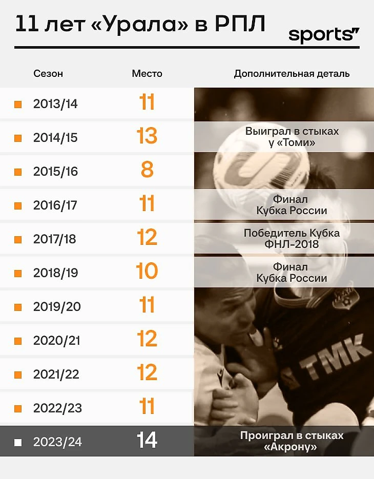 «Урал» уже плотно ассоциируется с Премьер-лигой. За эти 11 лет вылетала половина клубов Мир РПЛ (8 из 16), в том числе и «Динамо» в сезоне-2015/16.