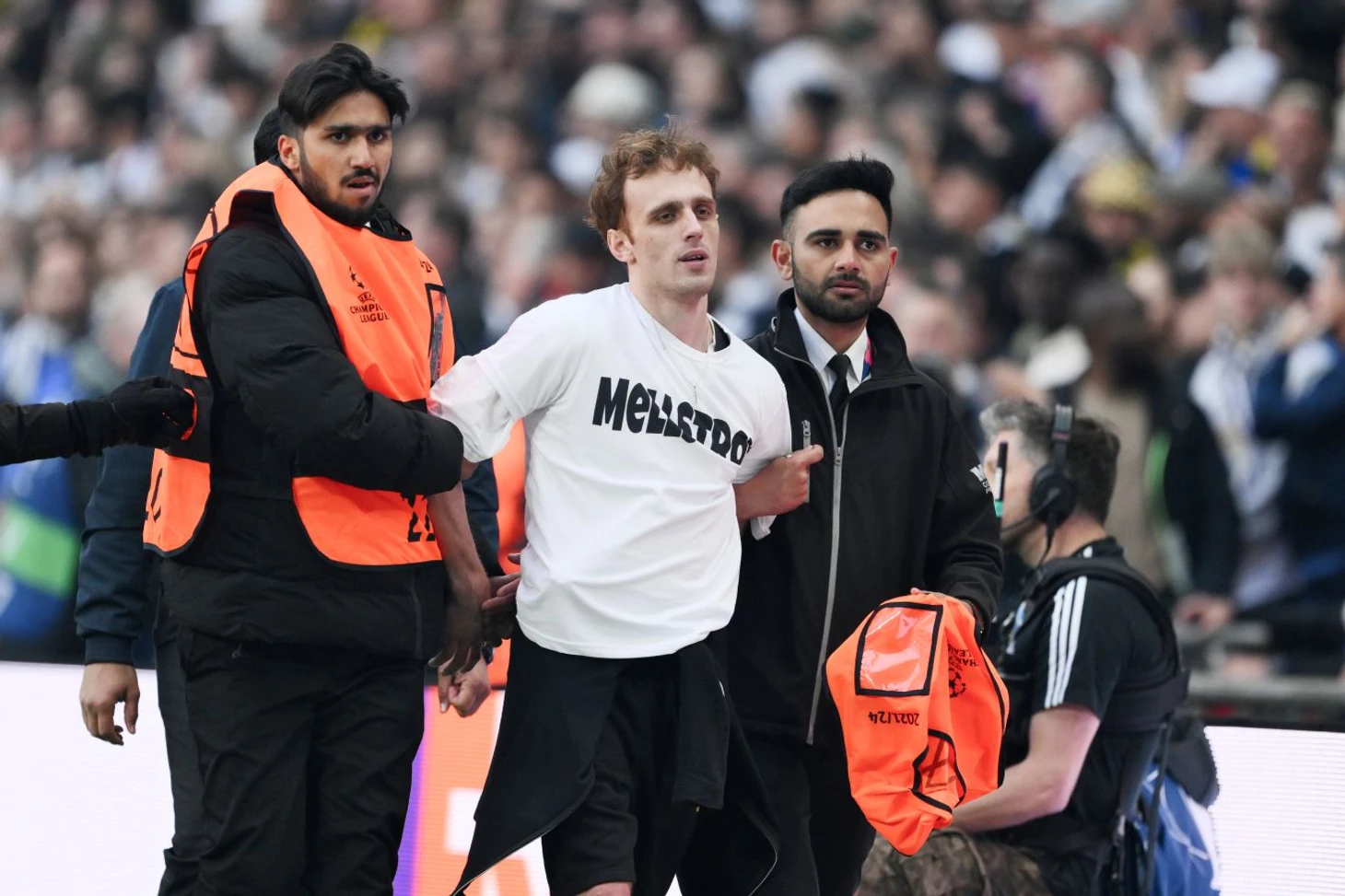Но матч был прерван уже через несколько секунд после начала, когда 2 болельщика выбежали на поле. Оба они были одеты в футболка с рекламой белорусского блогера-стримера Меллстроя — ранее тот обещал 30 миллионов рублей тому, кто выбежит на поле во время финала Лиги Чемпионов и прославит его на весь мир. В итоге выбежали сразу двое желающих заработать легких денег, причём один из них заодно сделал селфи с Винисиусом в центре поля. Как теперь будет делить выигрыш среди них Андрей Бурим и будет ли платить вообще — большой вопрос.