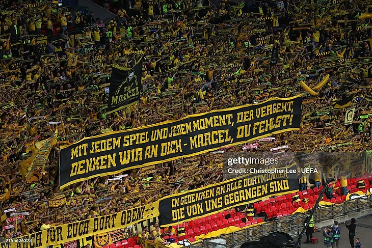 Ещё одним баннером немецкие болельщики почтили память своего друга по имени Марсель — он с является поклонником клуба и состоял в ультрас-тусовке, но в 2017 году у него нашли опухоль головного мозга. Первая операция прошла успешно, но через 4 года произошел рецидив. Повторная операция также прошла успешно, но год назад болезнь снова дала о себе знать. Трагедия ситуации была в том, что на этот раз опухоль была очень близко к двигательному и речевому аппаратам, из-за чего провести операцию уже было невозможно. Тогда и фанаты, и футболисты, и клуб сделали несколько красивых акций в поддержку своего друга — фанаты делали перфомансы, а игроки после матчей подходили к фанатской трибуне с баннерами со словами поддержки. Но в начале этого года рак оказался сильнее. Даже после этого ультрас неоднократно посвящали ему свои баннеры (например, на полуфинальной игре в Париже) — теперь вот отдали ему дань памяти баннером «В каждой игре и каждом моменте мы думаем о тебе. Марсель, мы скучаем по тебе!». Второй баннер был посвящён и остальным фанатам клуба, которые не дожили до этого дня: «В память обо всех покинувших нас дортмундцах».