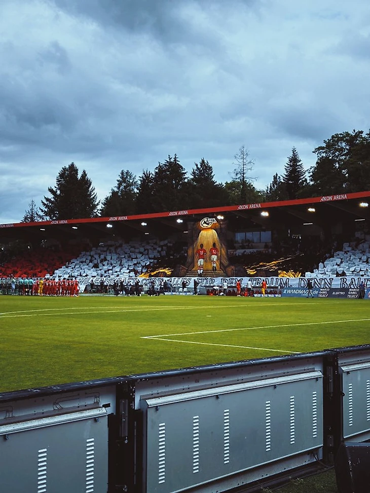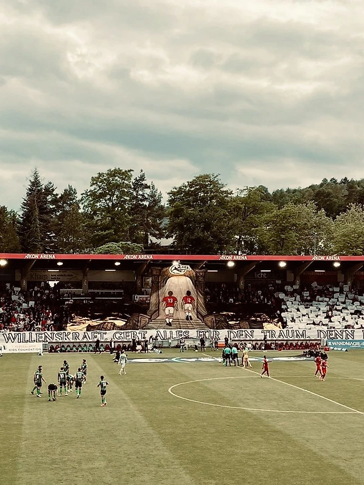 «Вюрцбургер Киккерс» — максимально скромная немецкая команда, высшим достижением которой стало выступление во 2-й Бундеслиге (в сезонах 1977/1978, 2016/2017 и 2020/2021). Но если окунаться в историю почти полувековой давности мы не станем, то вот о свежих выходах во 2-й по значимости дивизион Германии поговорить стоит, ведь туда команда пробивалась аж из шестого дивизиона, причём первый выход стал абсолютно уникальным, когда команда проделала путь от 6-й лиги до 2-й Бундеслиги всего за 5 лет! А вот во второй свой приход во 2-ю Бундеслигу клуб вполне мог в ней закрепиться, удачно проведя первый круг, однако повалился во втором и вылетел сначала в 3-ю лигу, а потом сразу и в четвёртую. Теперь же, кажется, клуб всерьёз намеревается вернуться — красно-белые уверенно выиграли региональную лигу Баварии, после чего отправились в переходные матчи против второй команды «Ганновера». Первый матч должен был состояться на «Акон Арене» в Вюрбурге. И ультрас «Вюрцбургера» подготовили к этой игре масштабный перфоманс на всю центральную трибуну!