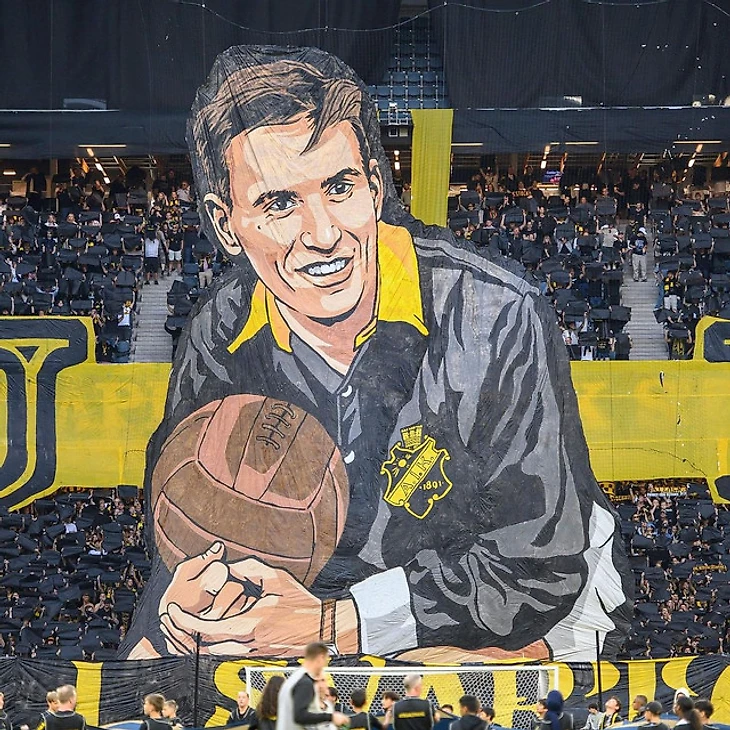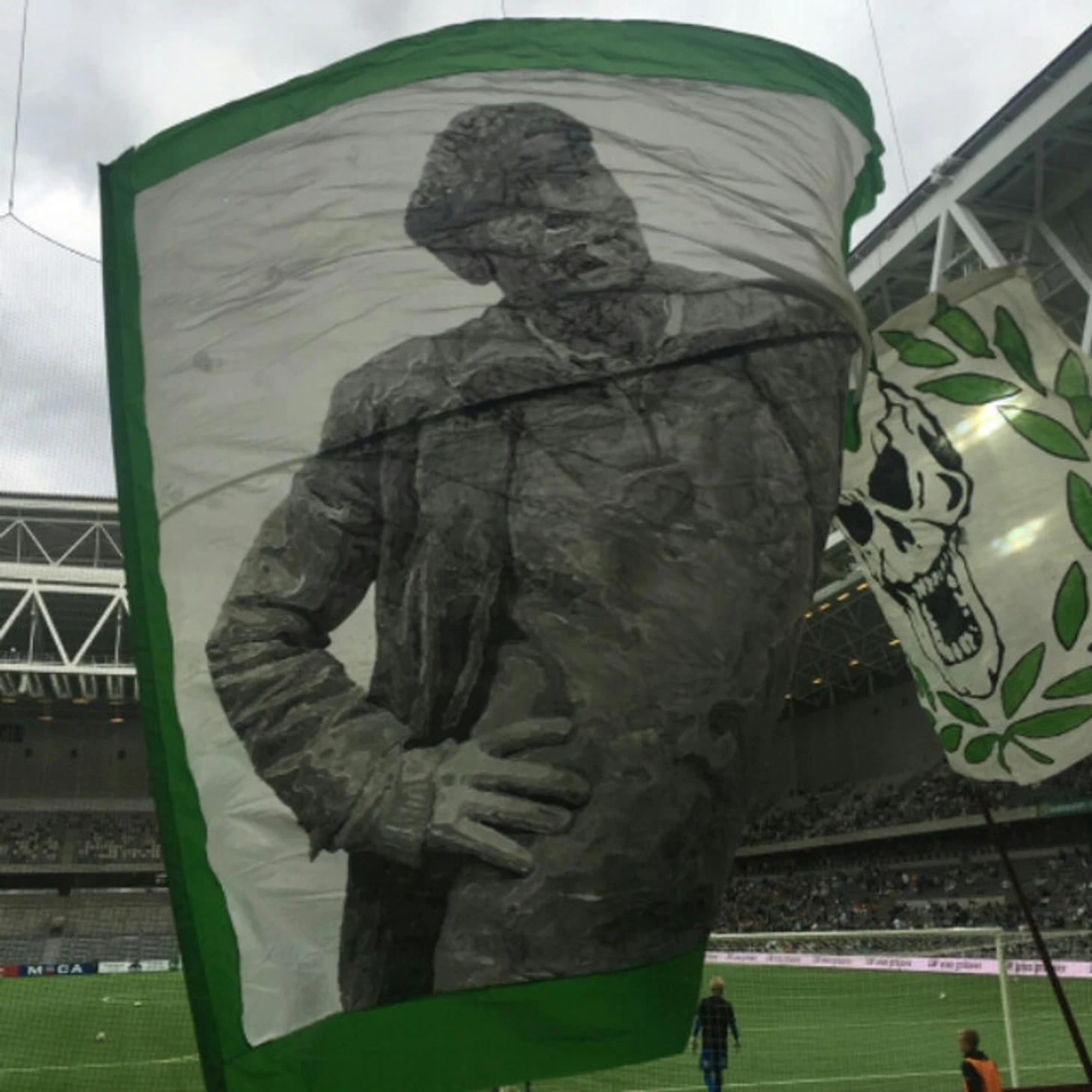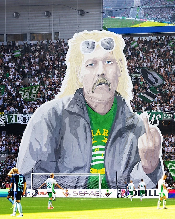 Зовут этого мужчину Кенетт «Кента» Густавссон, и он был довольно известным в Швеции рок-музыкантом. В жизни у него было 2 слабости — это «Хаммарбю» и наркотики, а их обеих объединяет песня «Сегодня я сильный», которую он написал в 1979 году. Позднее «Хаммарбю» стал использовать композицию в качестве своего гимна. Густавссон, как и любая рок-звезда, ушёл довольно рано, в 54 года — он умер от рака в марте 2003-го. Для ультрас «Хаммарбю» Кенетт, конечно, один из них и настоящий «байен» (прозвище «Хаммарбю»), а вот для фэнов «Юргордена» он — героиновый наркоман, неудачник и фиговый исполнитель. А баннер, как вы уже догадались, также был нарисован с его реального фото.