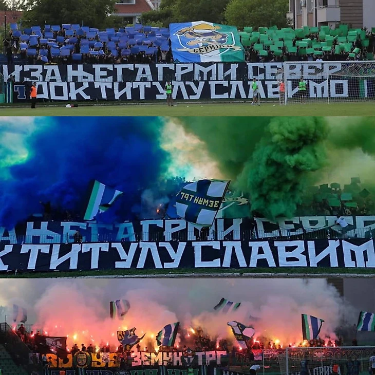 Это был последний тур чемпионата, но для хозяев он уже ничего не решал, так как «Земун» досрочно обеспечил себе первую строчку и выход во 2-й дивизион. Поэтому на самой игре ультрас-группа «Taurunum Boys» презентовала праздничный перфоманс «Север гремит позади нас, пока мы празднуем титул!» с синими и зелёными плашками в цвета клуба — именно одинаковые цвета, среди прочего, роднят их с фанатами наших «Крыльев». Очевидно, что титул праздновали игроки, север — это северная трибуна домашней арены «Земуна», на которой традиционно располагаются активные ультрас, а гремел север, потому что сразу после перфоманса фанаты зажгли сначала синие и зелёные дымы, а затем и 2-3 десятка файеров.