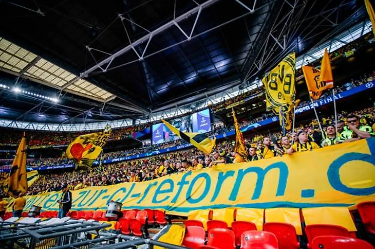 Как вы все уже знаете, следующий розыгрыш ЛЧ пройдёт уже в новом формате: количество участников расширится до 36, они будут разбиты на 4 корзины и каждая команда сыграет на групповом этапе 8 матчей (4 дома и 4 на выезде) — по 2 игры против двух рандомных команд из каждой корзины. Эти игры не будут повторяться как раньше, когда команда играла с одним и тем же соперником и дома, и в гостях — теперь только 1 игра. Затем будет построена общая таблица из 36 команд, по результатам которой первая восьмёрка сразу отправится в плей-офф, а команды с 9-го по 24-е места разыграют между собой стыковые матчи. Многим фанатам, и дортмундским в том числе, эти реформы не нравятся, поэтому они весь сезон активно протестовали против нововведений в их любимую игру. Не стал исключением и финал, где ультрас в очередной раз развернули баннер с адресом сайта против реформ в главном клубном турнире Европы.