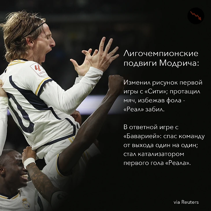 В матчах против «Баварии» Модрич осталась в тени из-за феноменальных действий Крооса, Винисиуса и спасателя Хоселу. Тем не менее, в первом матче Лука всего спустя 4 минуты вывел коронной шведой Винисиуса практически один на один. А во второй игре и вовсе стал одним из главных скрытных творцов успеха: сначала устремился в погоню за Павловичем, а вскоре перехватил мяч, посланный Нойером - ошибка, которая привела к голу.