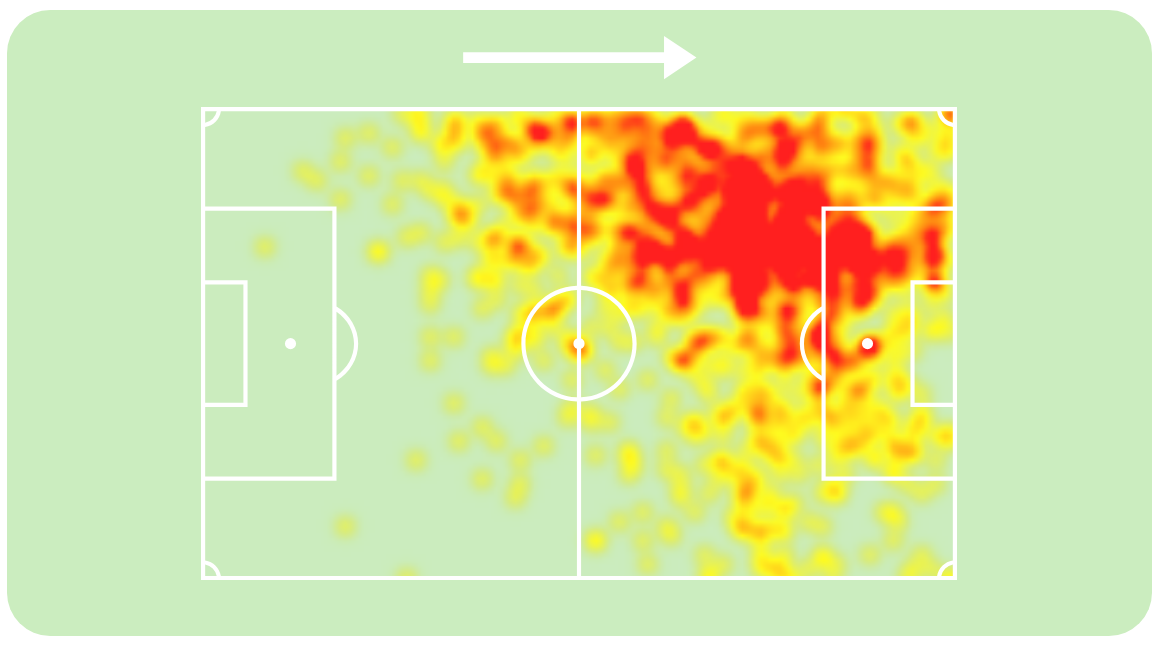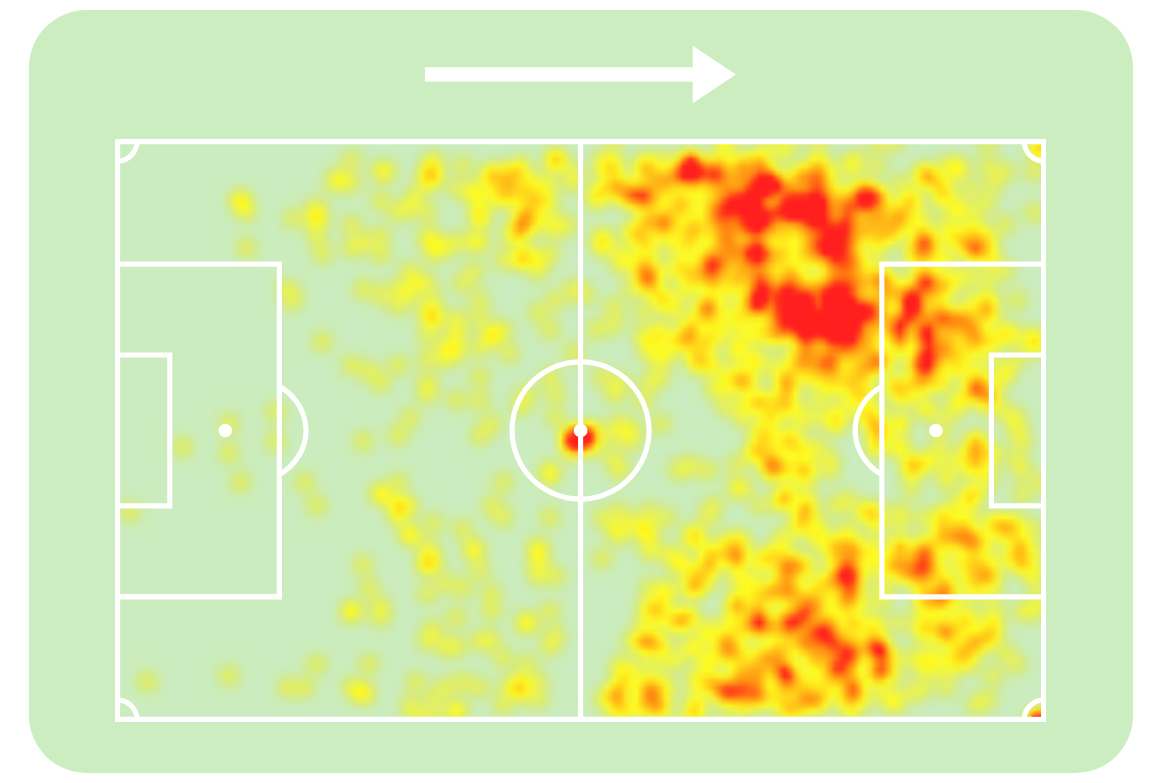 А вот тепловая карта Мбаппе – он играл с левого фланга или центрального нападающего, но использовал схожие зоны:
