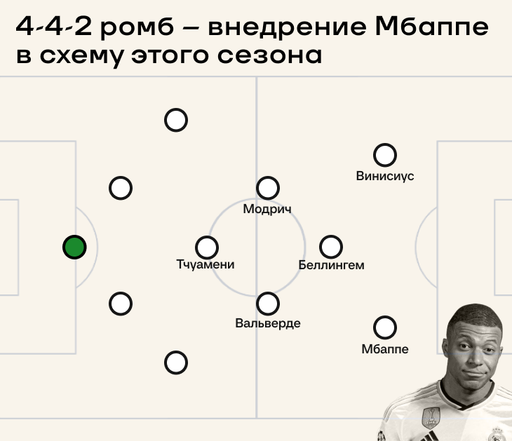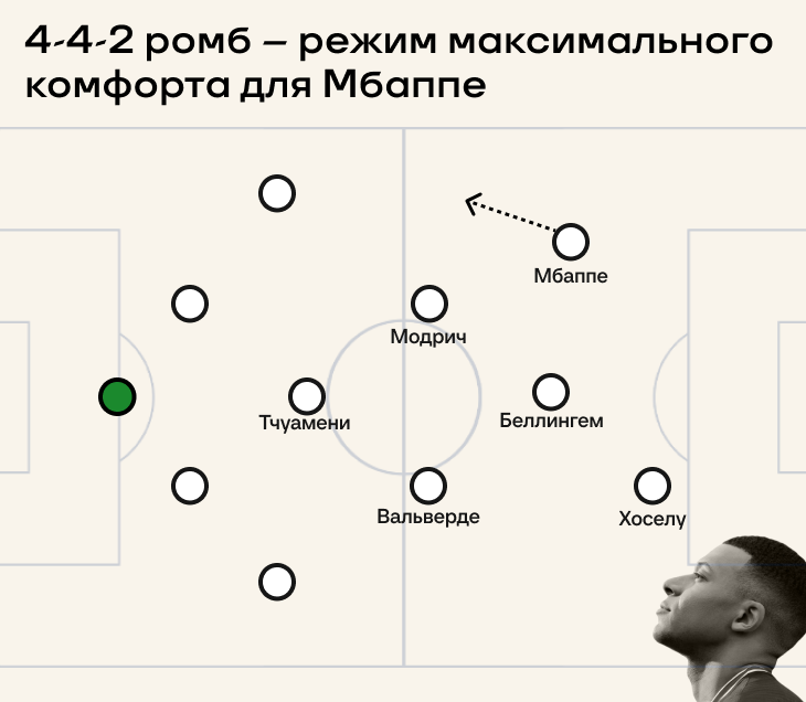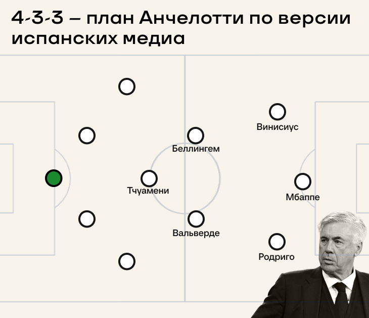 Путь первый: максимально держаться за схему этого сезона. Она представляла собой нечто среднее между 4-4-2 ромб и 4-4-2. Здесь две потенциальные позиции для Мбаппе, но нужно жертвовать либо Винисиусом, либо Родриго.