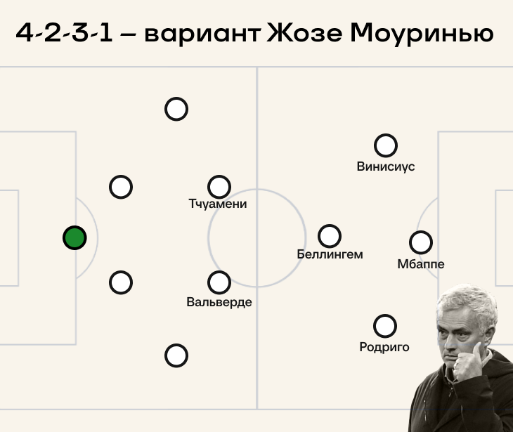 Очень похожий вариант в эфире TNT предложил Жозе Моуринью: «Беллингем будет меньше забивать. Система изменится. Они будут играть с тройкой Винисиус, Мбаппе, Родриго. Позиция Беллингема поменяется. Думаю, они выберут вариант с двумя полузащитниками и Джудом под тройкой нападения».