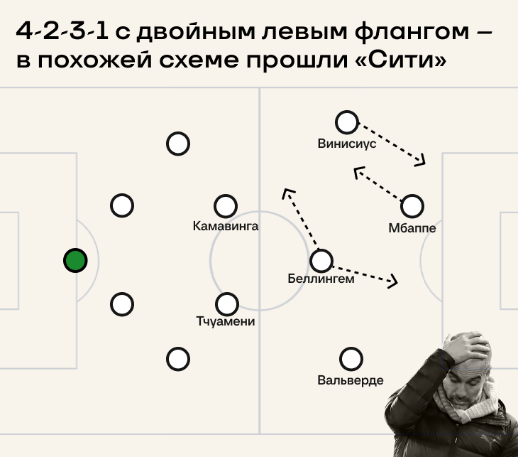 Также стоит рассмотреть вариант с двойным левым флангом, который использовался против «Сити» и «Баварии» в ЛЧ. Чисто формально он мог бы стать идеальным для союза Вини с Мбаппе: