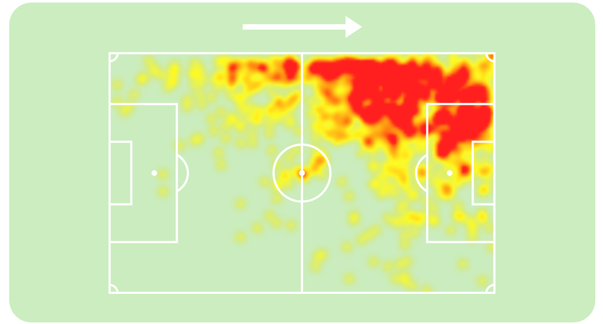 Так выглядела тепловая карта Винисиуса в этом сезоне – часто он формально стартовал нападающим, но на практике получал мяч на фланге: