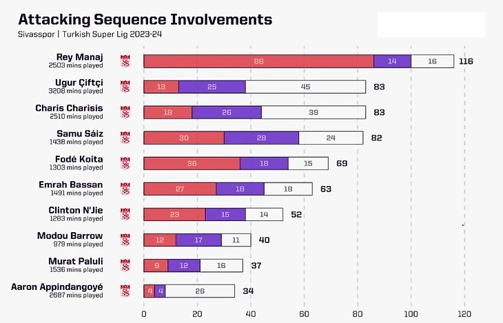 Роль Маная в «Сивасспоре» заключалась в том, чтобы быть на конце передач и быть на позициях, чтобы реализовать моменты. Его важность для «Сивасспора» нельзя не дооценить. Ни один гол Маная не стоил для своей команды больше, чем гол Маная, в то время как никто в высшей лиге не забил больше голов своей команды (38%).В прошлом сезоне он нанес 116 бросков в открытую, на 33 больше, чем любой другой игрок «Сивасспора», причем 86 из них, кто видел его роль в этой серии, это игрок, наносящий удар. Это на 50 больше чем у любого другого игрока Сивасспора в то время как только у Джеко (133) и Дениса Драгуша (93) было больше во всей лиге.