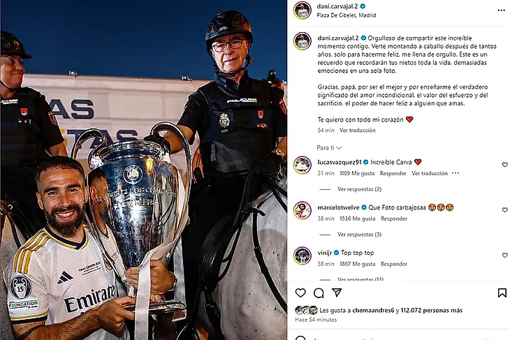 После празднования Десомоквинты осталось множество ярких историй и кадров. Одним из таких поделился Дани Карвахаль – латераль стал одним из главных героев финала на «Уэмбли», открыв счет в ворота «Боруссии» и выиграв уже шестой кубок Лиги чемпионов. Во время шествия картежа «Мадрида» к площади Сибелес отец Дани, служащий в полиции, сопровождал автобус на коне.