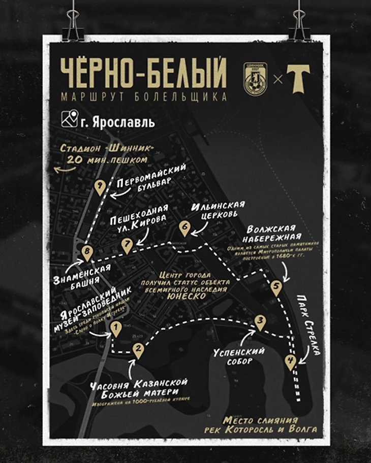 Выездная игра с «Шинником» осталась без афиши, зато клуб опубликовал путеводитель по Ярославлю. Но без культовой рюмочной «Афоня» это скорее туристический маршрут, а не маршрут болельщика! Поэтому записывайте адрес: ул. Революционная, 34. Ориентир – памятник Леониду Куравлеву и Евгению Леонову в роли сантехника Афони и штукатура Коли.