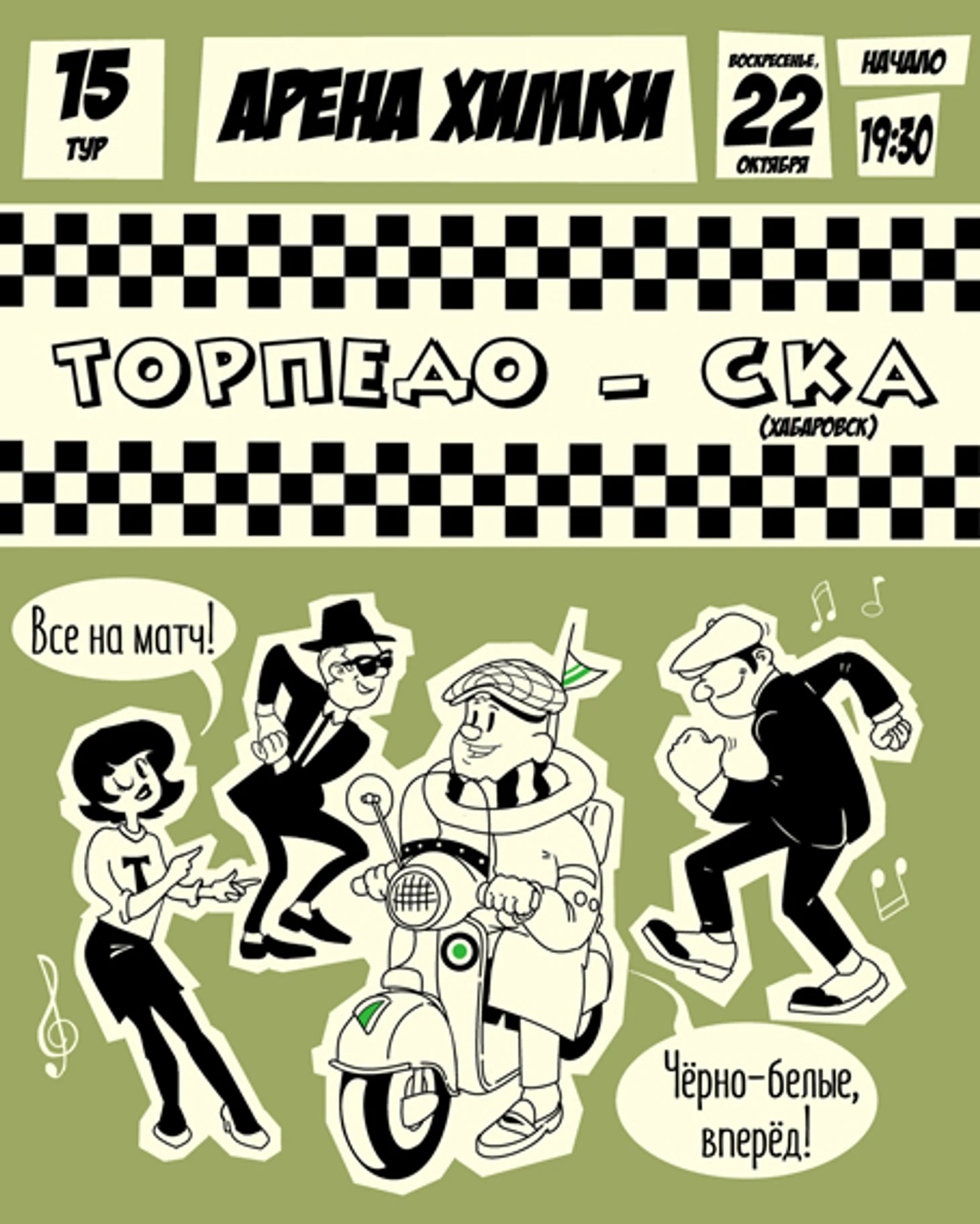 Афиша на матч против хабаровского СКА выполнена в стилистике ска-музыки: черно-белая клетка и танцующие человечки, похожие на Уолта Джабско – символа второй волны ска и британского музыкального лейбла 2 Tone Records.