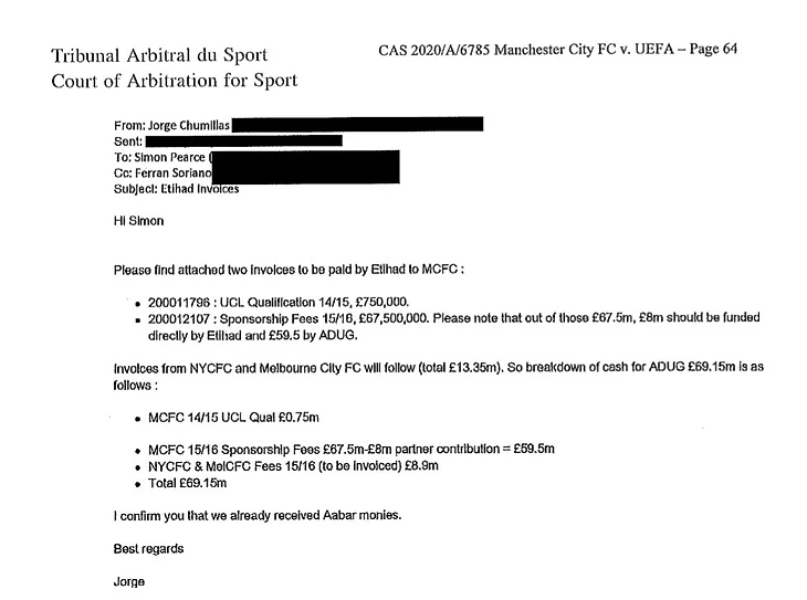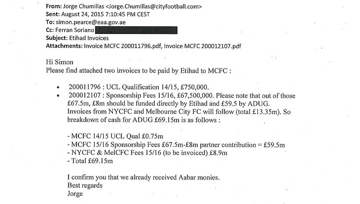 Письмо от Хорхе Чумильяса – CFO(финансовый директор) Ман Сити – Саймону Пирсу. Копия направлена Феррану Совиано – CEO(исполнительный директор) Ман Сити.