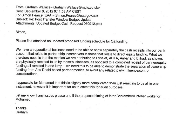 Ну и вишенка на торте, «𝘸𝘦 𝘯𝘦𝘦𝘥 𝘵𝘩𝘪𝘴 𝘵𝘰 𝘣𝘦 𝘢𝘣𝘭𝘦 𝘵𝘰 𝘥𝘦𝘮𝘰𝘯𝘴𝘵𝘳𝘢𝘵𝘦 𝘵𝘩𝘦 𝘴𝘦𝘱𝘢𝘳𝘢𝘵𝘪𝘰𝘯 𝘰𝘧 𝘰𝘸𝘯𝘦𝘳𝘴𝘩𝘪𝘱 𝘧𝘶𝘯𝘥𝘪𝘯𝘨 𝘧𝘳𝘰𝘮 𝘈𝘣𝘶 𝘋𝘩𝘢𝘣𝘪 𝘣𝘢𝘴𝘦𝘥 𝘱𝘢𝘳𝘵𝘯𝘦𝘳 𝘮𝘰𝘯𝘪𝘦𝘴, 𝘵𝘰 𝘢𝘷𝘰𝘪𝘥 𝘢𝘯𝘺 𝘳𝘦𝘭𝘢𝘵𝘦𝘥 𝘱𝘢𝘳𝘵𝘺 𝘪𝘯𝘧𝘭𝘶𝘦𝘯𝘤𝘦/𝘤𝘰𝘯𝘵𝘳𝘰𝘭 𝘤𝘰𝘯𝘴𝘪𝘥𝘦𝘳𝘢𝘵𝘪𝘰𝘯𝘴». Грэм говорит о том, что все это нужно для того, чтобы показать отличие между финансированием владельца и их партнеров из Абу Даби, для предотвращения возможных обсуждений происхождения платежей. Но ведь Саймон – адресат письма – не должен иметь никакой возможности влиять на то, как и сколько денег клубу перечисляют спонсоры? 🤔