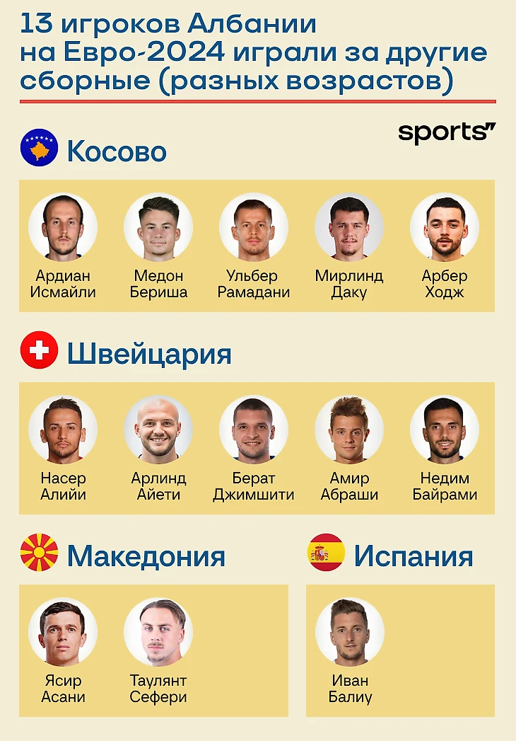 Мирлинд Даку из «Рубина» – косовский албанец, играл даже за взрослую сборную Косово, но в 2023-м получил албанский паспорт. Похожая история у Ардиана Исмайли и Ульбера Рамадани. А вот Арбер Ходжа и Медон Бериша родились в Германии и Швейцарии соответственно, но до Албании играли за Косово.