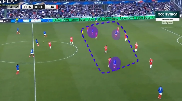 И вот, что придумал Дидье, внимание на вот эту троечку, это Гризман, Тюрам и Мбаппе, по сути три номинальных форварда и каждый из них может спокойно сыграть в центре, именно поэтому они постоянно меняются и не теряют при этом в качестве.