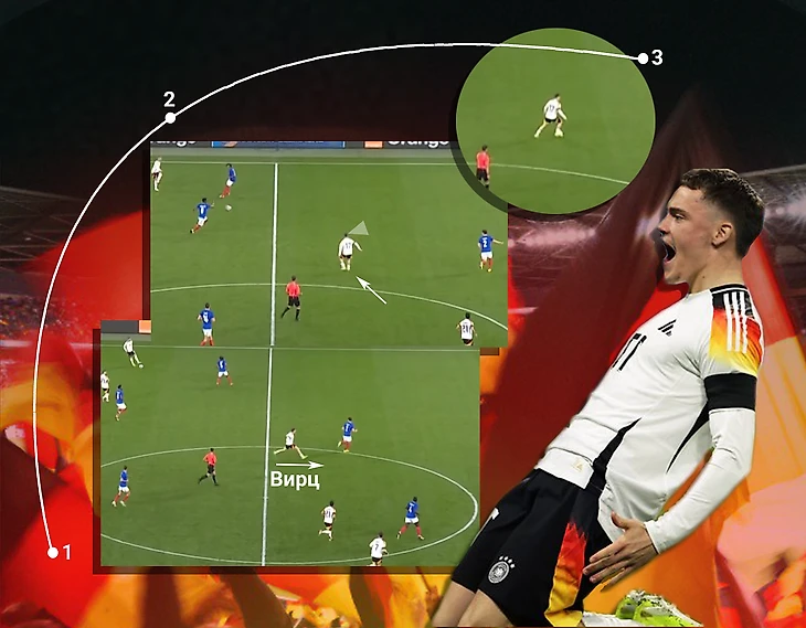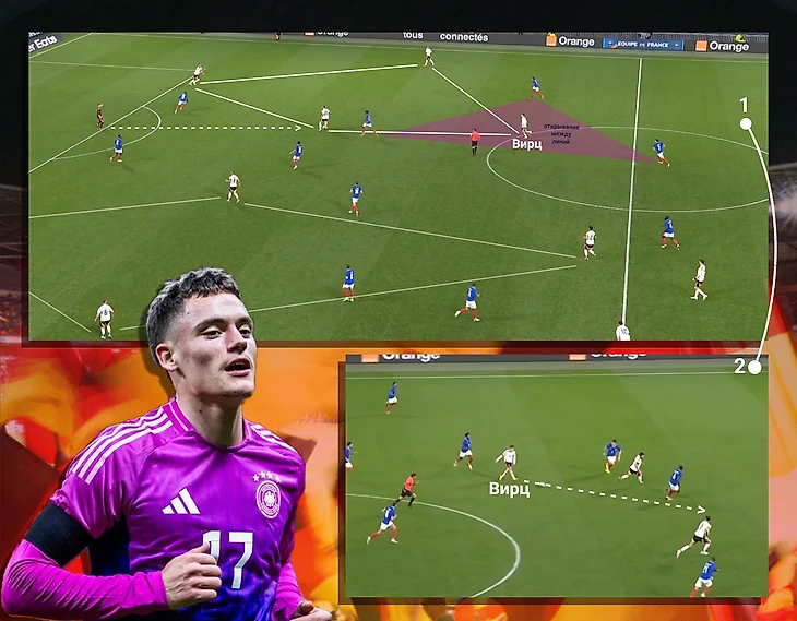 На эти идеи Нагельсмана накладывается еще и мастерство игроков. Между двумя скриншотами на верхней картинке происходило еще кое-что очень важное. Вирц для более комфортного приема мяча сделал ложный рывок вперед, на который купился защитник. После этого, в момент, когда передача от партнера уже настигала Флориана, он успел посмотреть вперед. Убедившись, что его никто не накрывает, он первым же касанием принял мяч вперед: