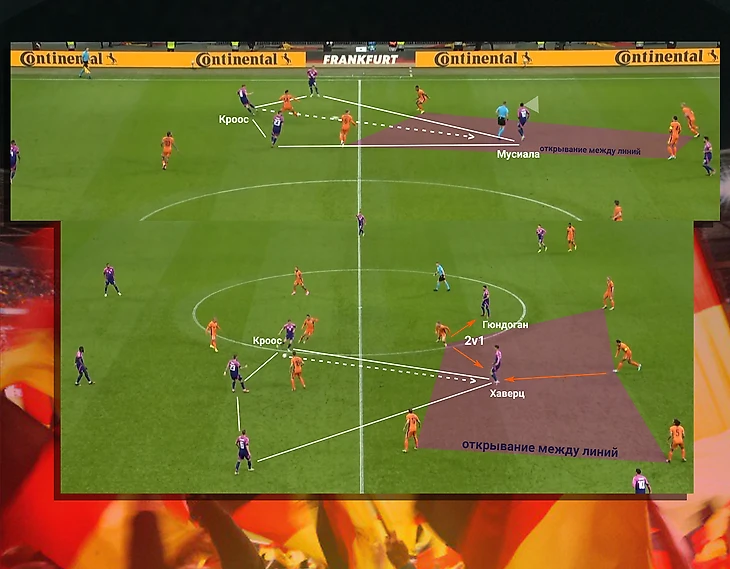 Обратите внимание на нижний скриншот. Гюндоган и Хаверц (О! Против Нидерландов он уже нападающий) открылись в зоне, где они имеют численное большинство, а своевременное движение в нее не позволило защитнику (Ван Дейку) подняться и уровнять количество игроков. Три 10ки