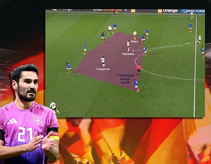 Пространство между линий - это естественная среда обитания для Гюндогана, Мусиалы и Вирца, поэтому это частый способ продвижения мяча немцами: