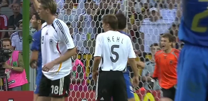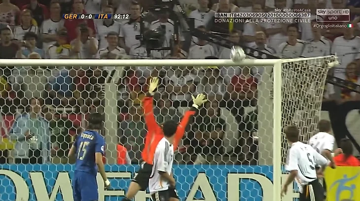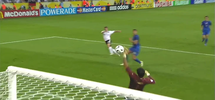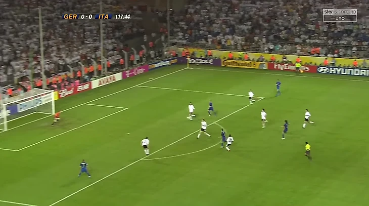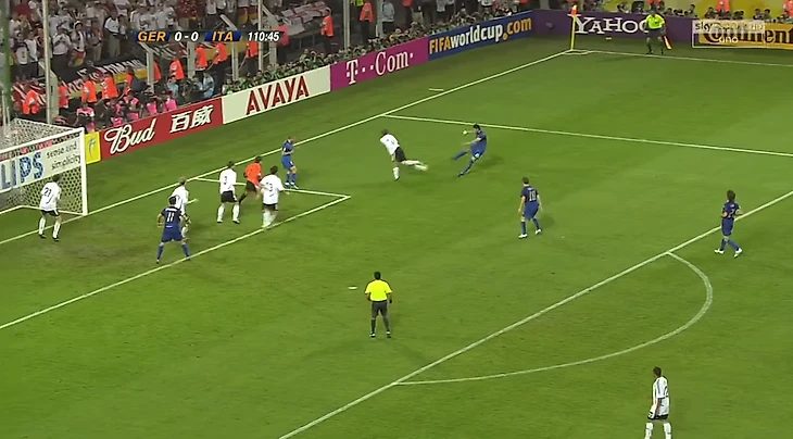 Начало дополнительного времени – моменты у итальянцев. Первый овертайм начался со штанги и перекладины ворот Йенса Леманна. Сначала Джилардино на фланге корпусом оттеснил от мяча Метцельдера – как ребенка. Защитник немцев упал, а итальянец убежал в штрафную, убрал там финтом Михаэля Баллака и пробил в ближний угол. Спасла штанга.