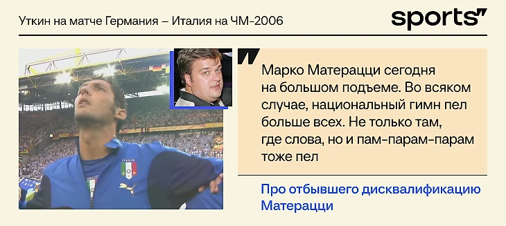 Перед матчем – истории про дисквалификации. Во время гимнов Василий обратил внимание на отбывшего Марко Матерацци: защитник удалился в матче против Австралии, но вернулся как раз на полуфинал. И был настроен максимально эмоционально.