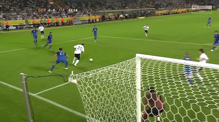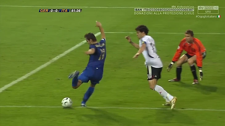 Первые опасные моменты – у итальянцев. Уже на третьей минуте Франческо Тотти бил в створ со штрафного, потом выводил на удар Симоне Перротту – оба раза Йенс Леманн справился. Но на 24-й минуте немецкий вратарь напихал защитникам, ведь после навеса Пирло забыли в штрафной двух самых опасных игроков.
