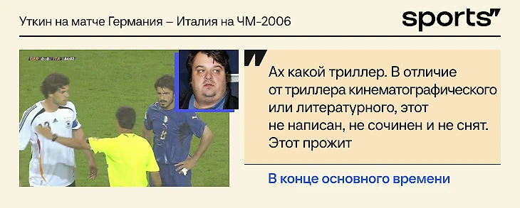 Второй дополнительный тайм и атакующие замены. Липпи еще до перерыва потратил обе замены – выпустил Дель Пьеро и Винченцо Яквинту. А вот немцы заменили Клозе на нападающего Оливера Нойвилля только во втором тайме дополнительного времени – и все эти ходы искренне восхитили Уткина.
