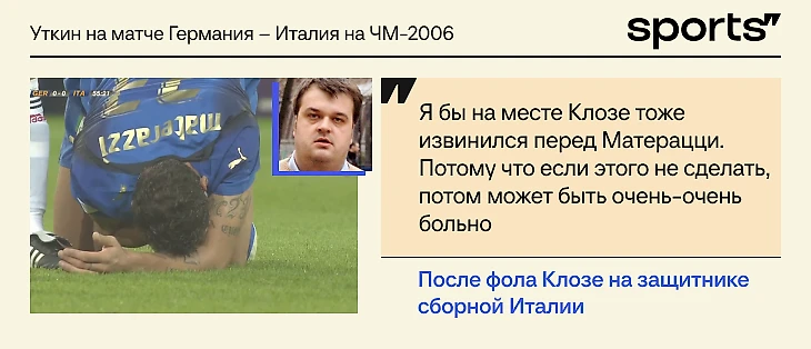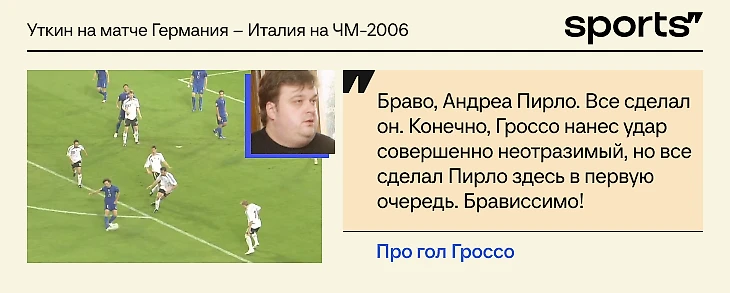 «Какой пас Шнайдера, потайной! И Подольски – вот его фирменный разворот! И Матерацци поддался на этот финт. Помните, как Каннаваро в первом тайме не поддался, а Матерацци болтанулся и свалился в сторону».