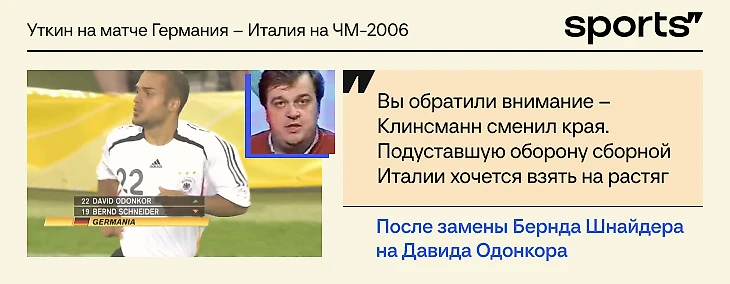 Марчелло Липпи заменил Луку Тони на Альберто Джилардино, а Юрген Клинсманн выпустил Бастиана Швайнштайгера и Давида Одонкора вместо Боровски и Шнайдера. Уткин раскусил хитрый план Юргена.