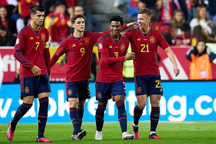 Группа атаки - пестрая. Вечно молодой Дани Ольмо снова будет руководить атакующими построениями у чужой штрафной. Здесь без изменений. Но, стоит упомянуть Алекса Баэну из «Вильярреала». Новое лицо в сборной всего с тремя матчами в активе, зато уже с голом. На флангах - молодость, амбиции и талант. Нико Уильямс из «Атлетика» и самый известный юниор планеты - Ламин Ямаль. Парни точно не зря занимают свое место в составе, но готовы ли они решать в нужный момент - увидим. Главная же персона в атаке - Альваро Мората. Попрошу не смеяться! В сборной этот парень всегда хорош. Действующий лидер по матчам (72) и голам (34 - пятый в истории, впереди Сильва - 35 и Торрес - 38, которых можно обогнать уже на этом первенстве). Плюс у Альваро целых 6 голов на предыдущих турнирах всего за 10 матчей!