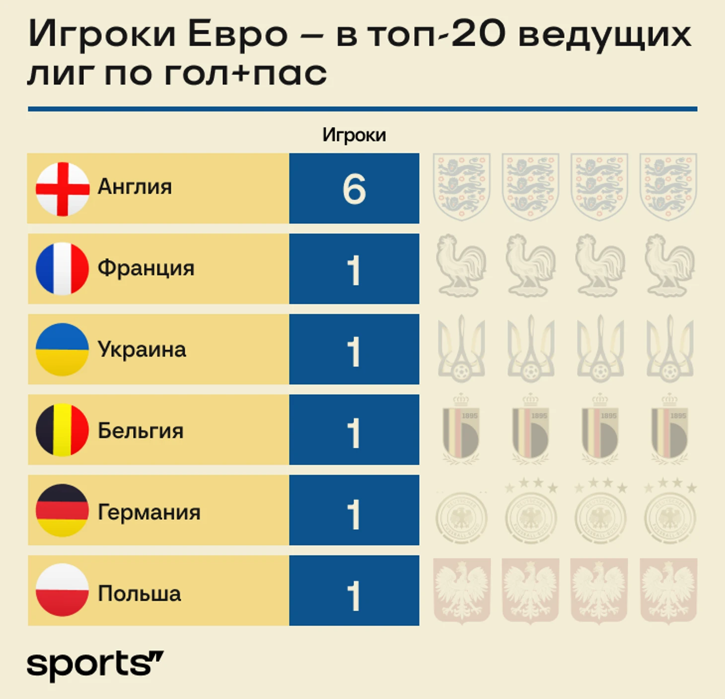 Сразу 6 игроков из заявки Саутгейта – в топ-20 в сборном зачете всех ведущих лиг по гол+пас. У всех остальных сборных – максимум 1 представитель.