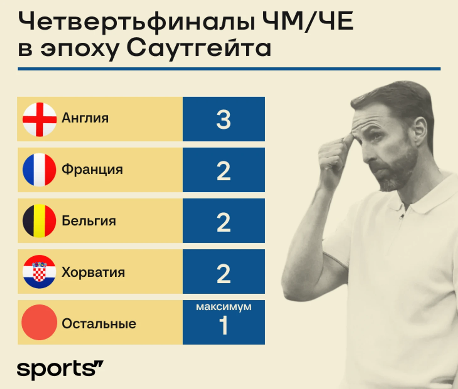 Результаты. Англия ничего не выиграла при Саутгейте, но всегда избегала провалов. На каждом турнире – минимум четвертьфинал (всего – три попадания). В эпоху Гарета лучший показатель среди европейских сборных.