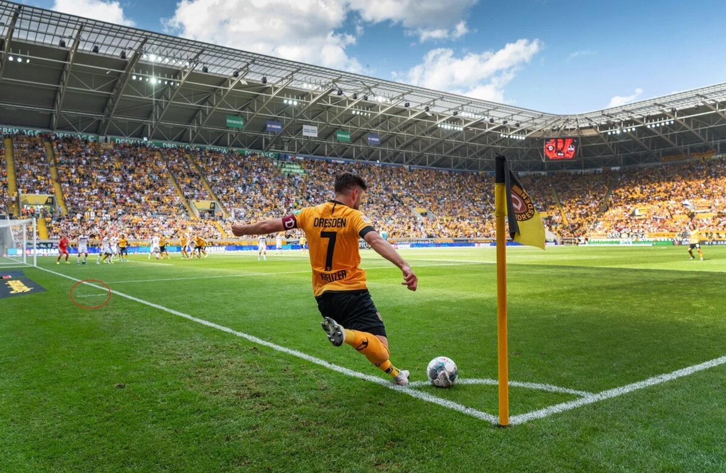 Угловые сектора. Обозначены на каждом из четырех углов поля. Если мяч ушел от обороняющейся команды за лицевую линию, то назначается угловой удар. Мяч устанавливают на угловой сектор и производят подачу в штрафную, прострел или розыгрыш мяча.