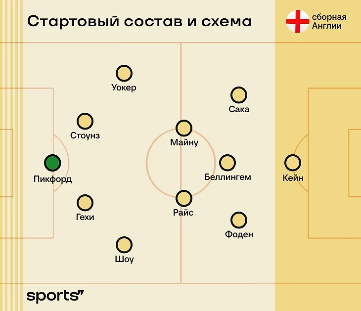 Гарет не откажется от привычной схемы 4-2-3-1 (альтернатива – 3-4-3) с Кейном на острие и Беллингемом в роли свободного художника. Будет сильный акцент на фланги, где у Англии достаточно скоростных игроков с дриблингом, будут частые подключения в атаку крайних защитников. Вы же помните, что Люк Шоу забил уже на 2-минуте финала Евро-2020?