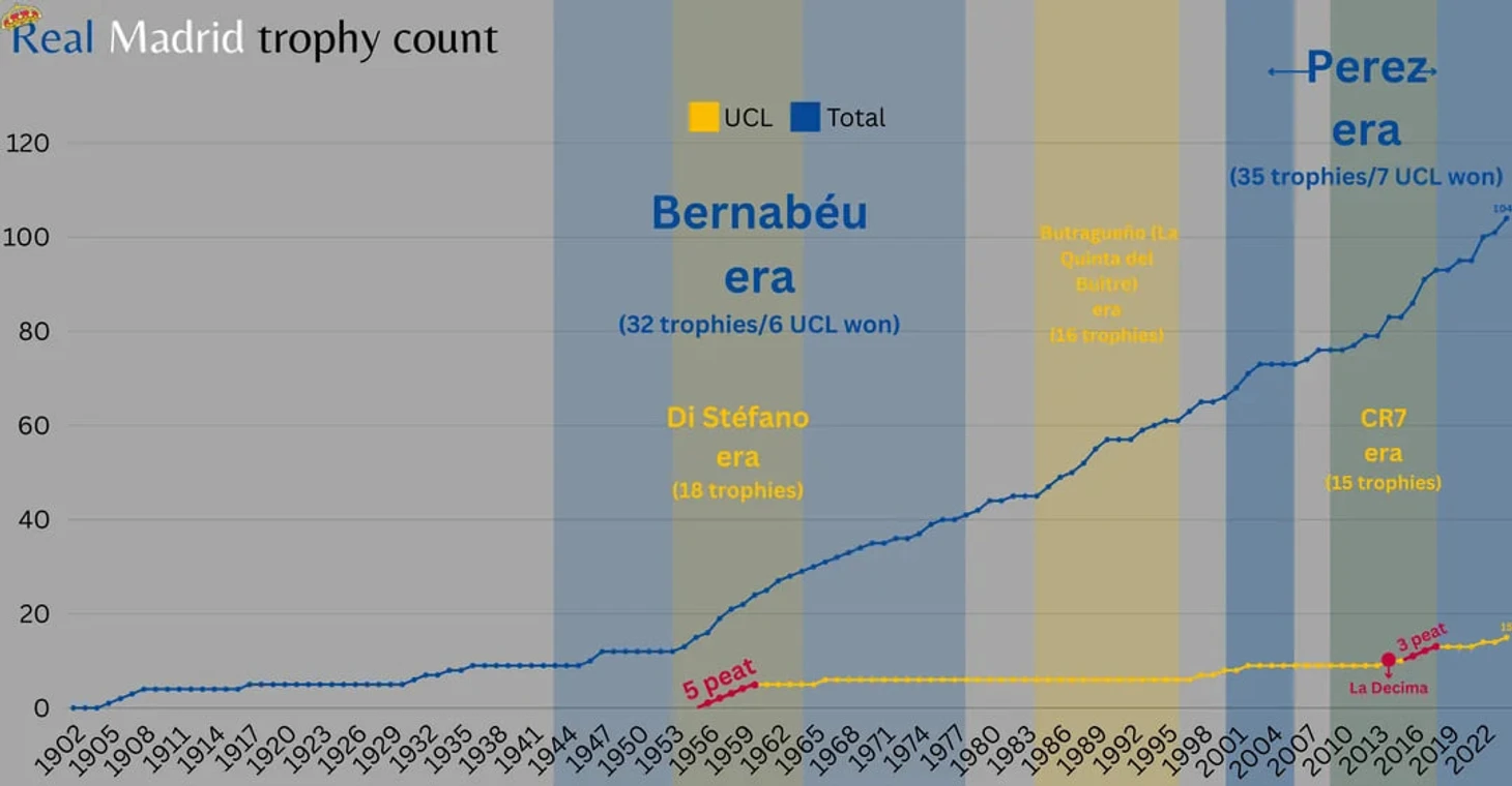 Болельщик «Мадрида» под ником 77SidVid77 на Reddit составил удобный график, на котором можно отследить исторический прогресс команды с точки зрения завоеванных трофеев.