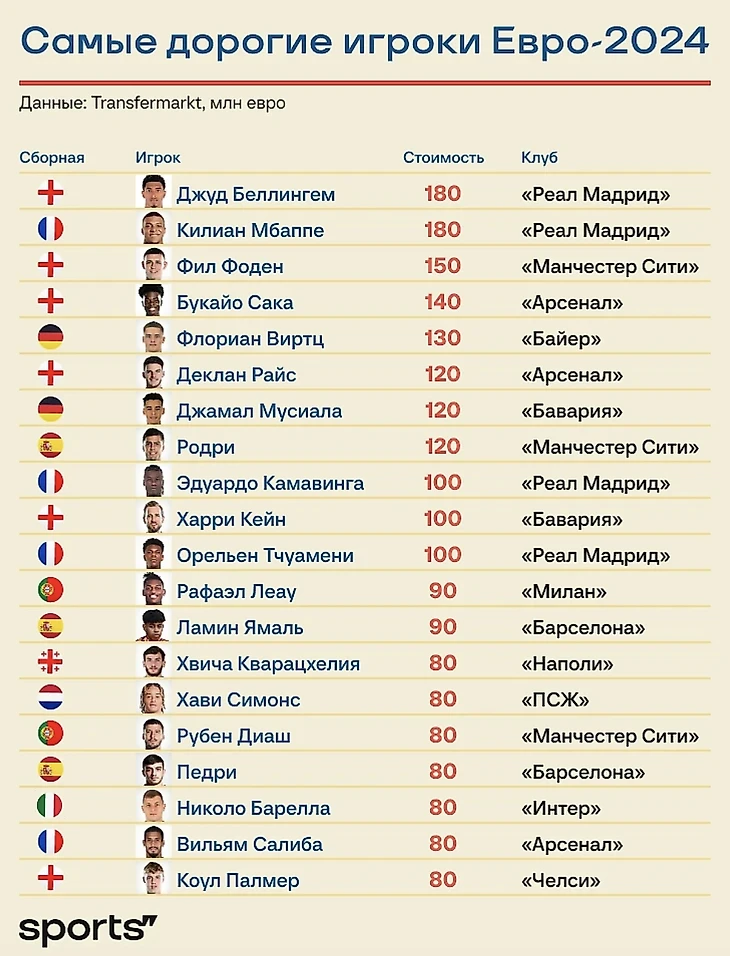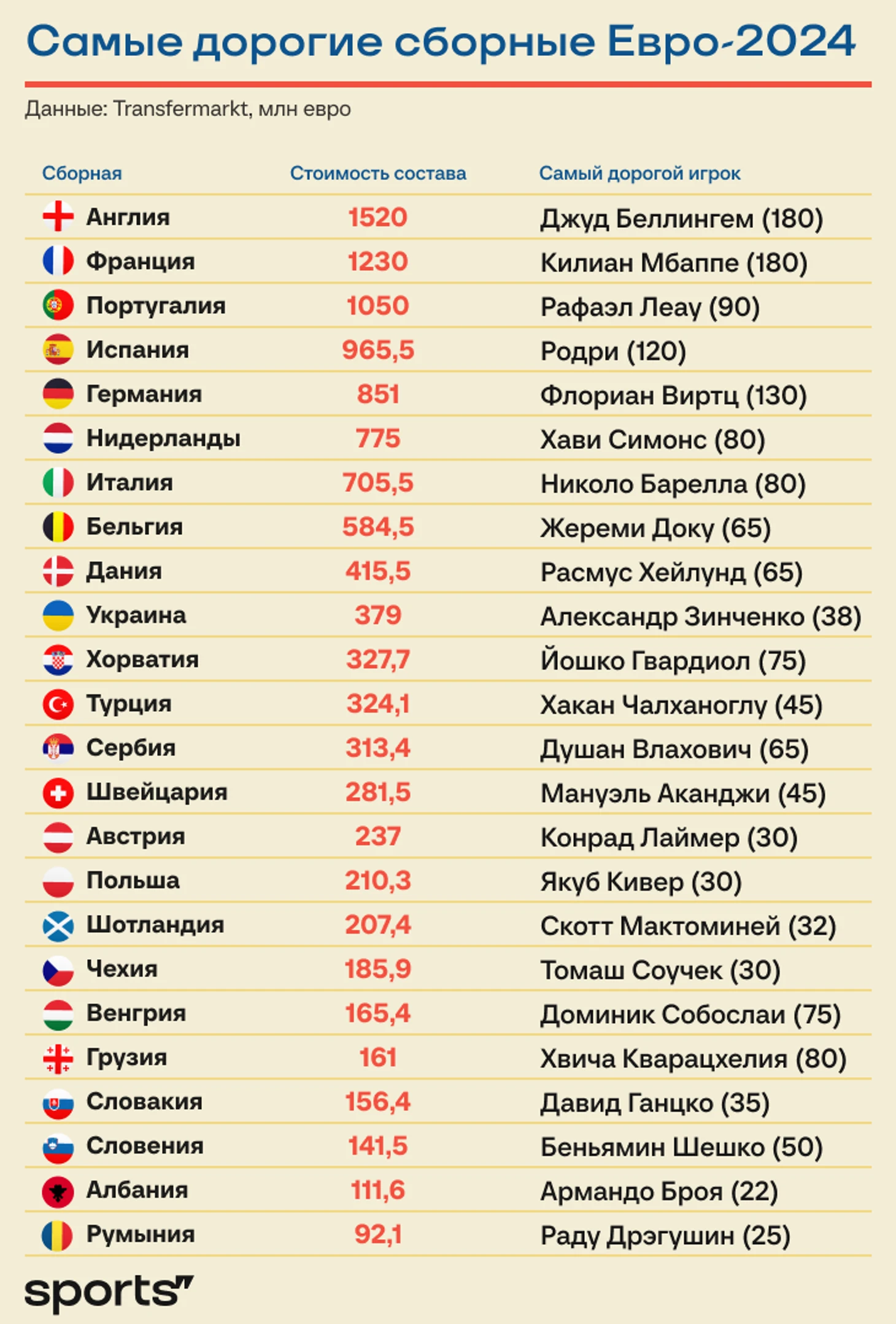 ● Самая дорогая сборная турнира – Англия: оценивают в 1,5 миллиарда евро, отрыв от Франции – почти 300 млн. Золотые англичане: Джуд Беллингем (180 млн), Фил Фоден (150), Букайо Сака (140), Деклан Райс (120) и Харри Кейн (100).