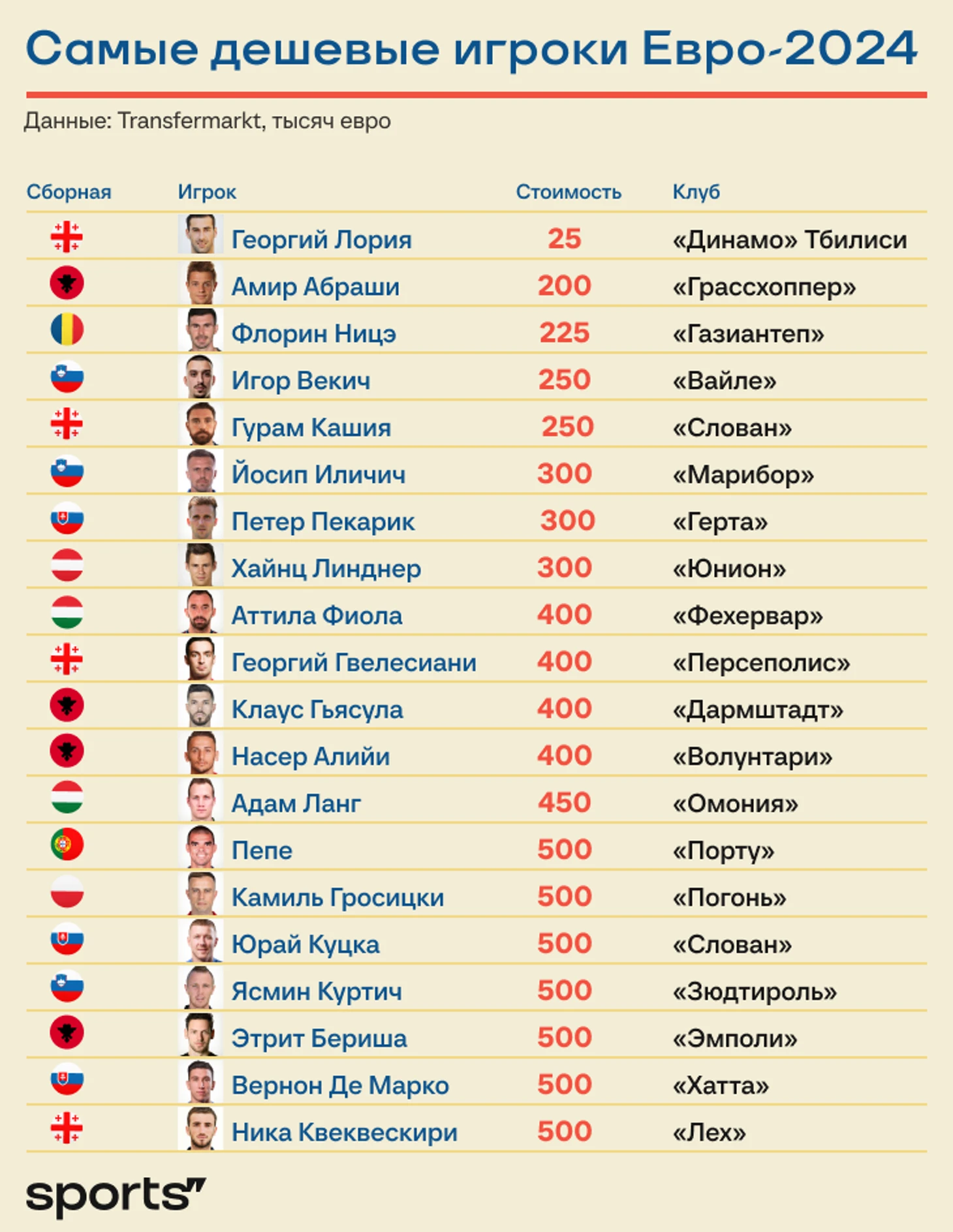 ● Самый дешевый игрок Евро-2024 – Георгий Лория из тбилисского «Динамо», оценивают в 25 тысяч евро. Это 38-летний вратарь, можете помнить его по игре за «Крылья Советов» и «Анжи». В 2023-м вернулся в Грузию после четыре лет в кипрском «Анортосисе».