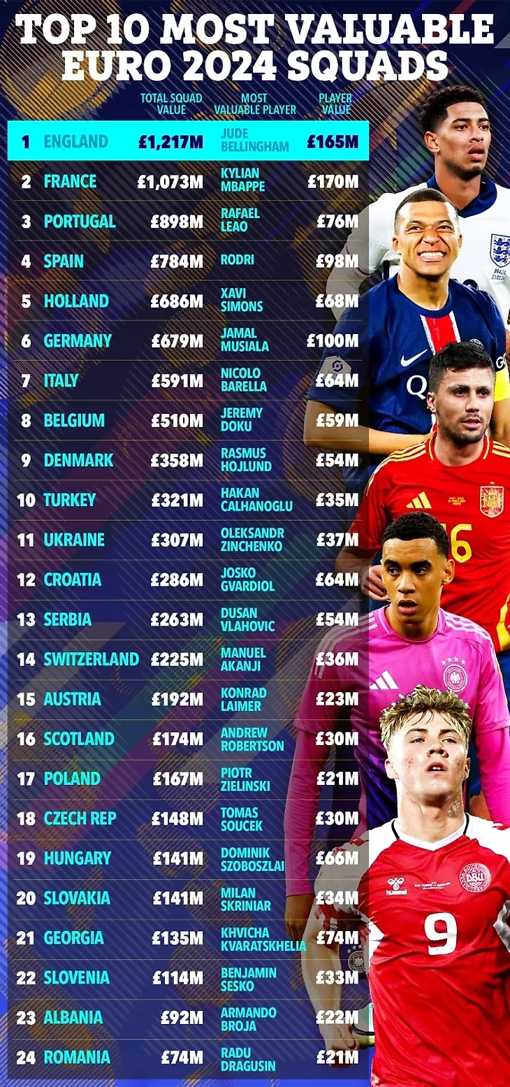 Хотя 20-летний Беллингем оценивается в 165 миллионов фунтов, Килиан Мбаппе обошел его, став самым дорогостоящим игроком турнира. 25-летняя суперзвезда Франции стоит невероятные 170 миллионов фунтов стерлингов.