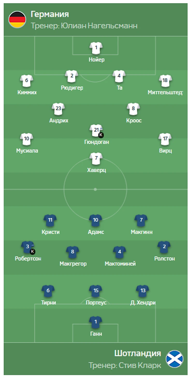 Шотландия хорошо защищалась в начале тайма, скорее потому, что других вариантов в меньшинстве при счете 3:0 нет, задача не пропустить ещё больше. На 63-й минуте Нагельсманн выпустил Фюллькруга и Сане вместо Хаверца и Вирца соответственно.