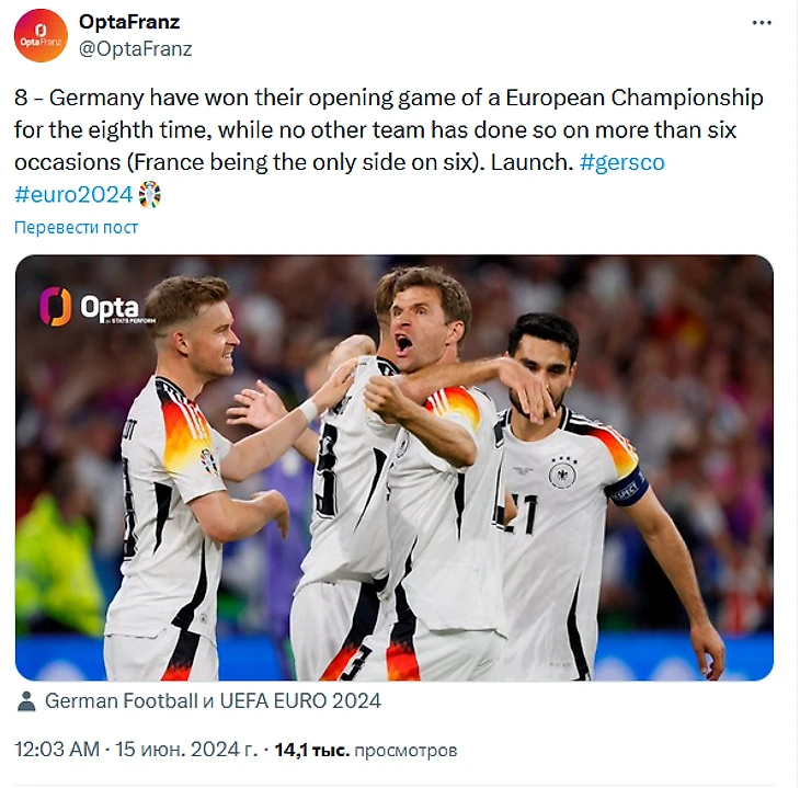 Без длинных предисловий начинаем чемпионат Европы по футболу 2024 года. В матче открытия турнира встречались сборные Германии – хозяйки турнира, и Шотландии. Последний раз они встречались в 2015, а в общей сложности этот матч стал 18-м в истории.