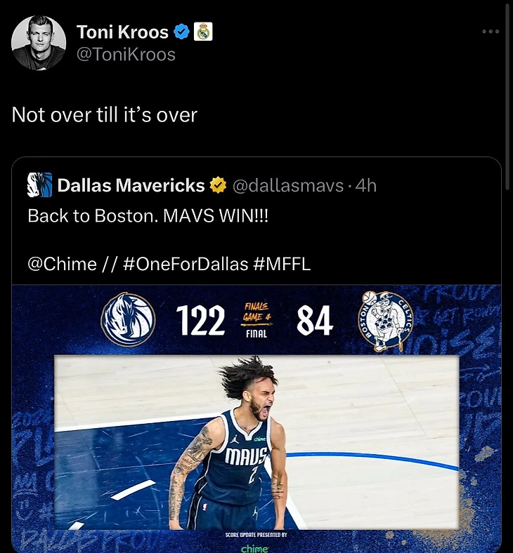 А у немца футбольный сезон еще не закончен – он играет на Евро в Германии, но за НБА продолжает следить. После победы «Даллас» Кроос написал: «Это не конец, пока ничего не закончено».